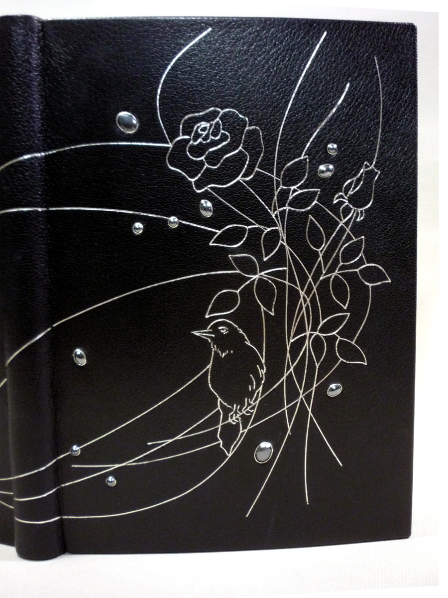This copy of the Rubaiyat by Omar Khayyam was illustrated by Willy Pogany. The illustrations were all printed in black on a white paper so I decided to do the binding in black goatskin with silver tooling. This binding was also my first attempt to add jewels to a binding.
